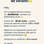 - Horario de verano¡Estrenamos horario de verano!Hola,Con la llegada del buen tiempo, en ACORAVAL también nos adelantamos al sol.A partir del 20 de Junio , nuestro horario de atención… Lee más: Horario de verano